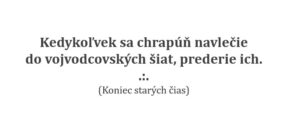 VIRTUÁLNA REALITA Nekŕmte nás odpadom. Neohlupujte nás malichernosťami. Netlačte nás do virtuálnej reality. Nerobte z ľudí tovar. Každý deň sa učím, že všetko tu je dočasné a je mi preto na smiech to večné čvachtavé pachtenie sa po mizivom marive, ktoré ničím nenaplní hroby, iba pozostalým uberie z nádeje, že svet mohol byť krajším… Žiadna [...]